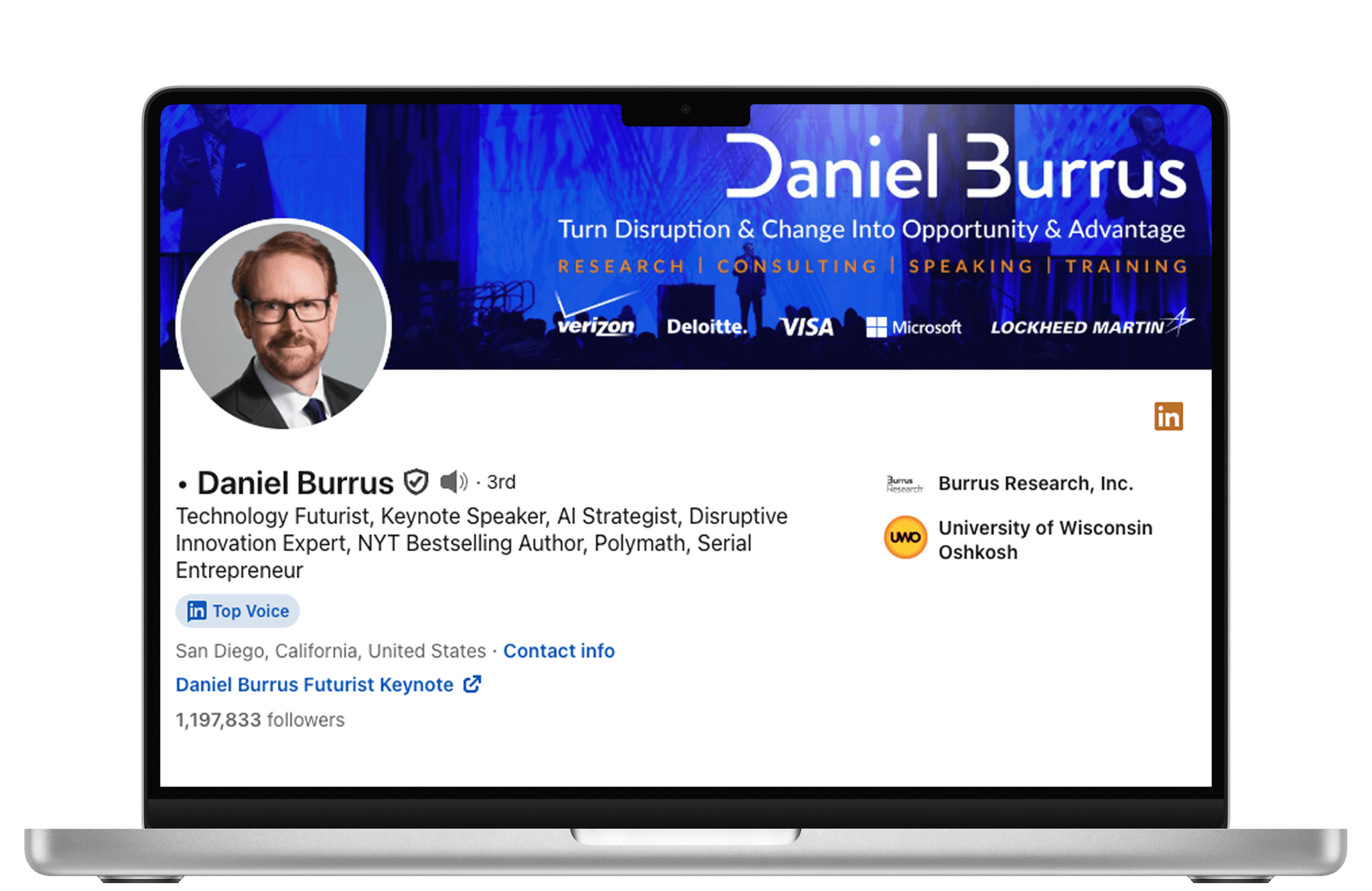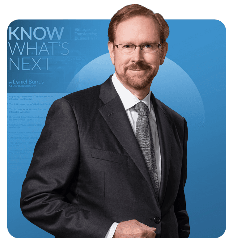 For over four decades, Daniel Burrus has been the world's most trusted guide to the future of business. He has a proven, documented track record of accurately predicting the future of technological change and its impact on organizations worldwide. He has advised executives from Fortune 500 companies, the Pentagon, and heads of State, helping them to develop game-changing strategies based on his proven methodologies for capitalizing on technology innovations and their future impact.